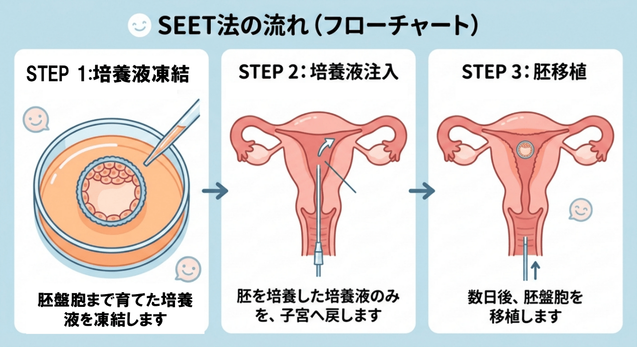 SEET法(Stimulation Endometrium Embryo Transfer)は、凍結融解胚移植(FET)の前に、胚培養液を子宮内に注入して子宮内膜を刺激する方法です。