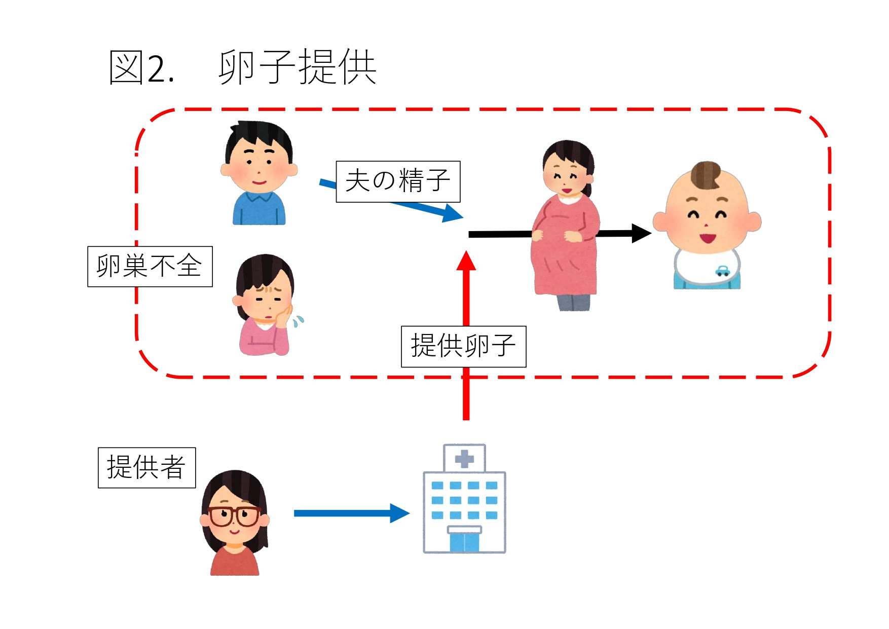 この二つの治療は無精子症や、卵巣不全といった、赤ちゃんをつくるための精子や卵子を持っていない方が子どもを欲しいと思ったとき、他の方から精子や卵子を提供してもらって子どもをつくるための治療です(図1、図2)。