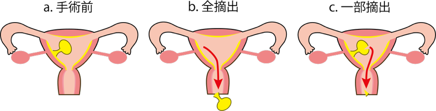 - もう半分は同じく子宮鏡だが、全部とらずにポリープの一部だけをとる(一部摘出;図1,b、悪性でないことを確認するため)